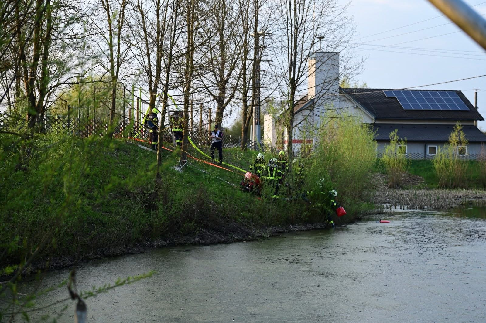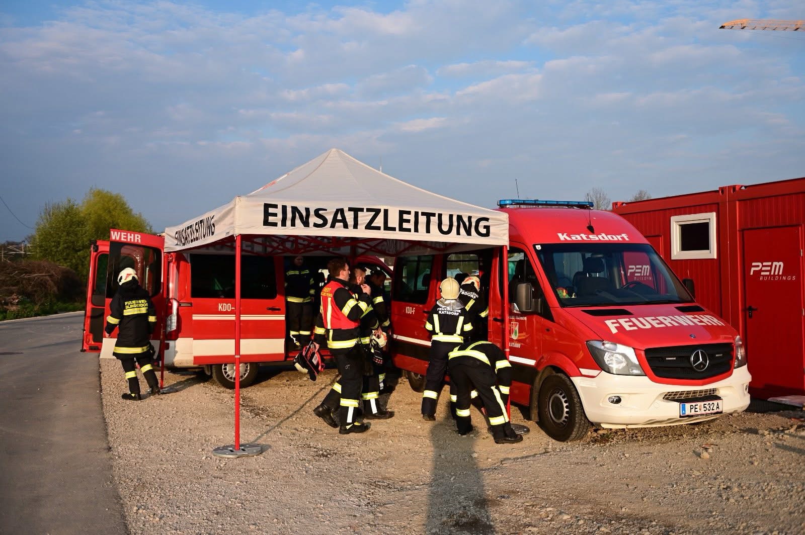 Zur Wasserversorgung wurden drei Tragkraftspritzen beim Teich des Motorikparkes an verschiedenen Standorten platziert, um die Verfügbarkeit zu erproben. Die anwesenden Mitarbeiter der Firma Schumoto wurden über eine Leiter von einer Terrasse am anderen Ende des Daches gerettet und anschließend betreut. Beim Eintreffen der Teleskopmastbühne Mauthausen wurde diese am südwestlichen LKW-Rangierplatz positioniert. Drei Übungsbeobachter aus dem Abschnitt haben uns während der gesamten Übung auf die Finger geschaut und durch ihre konstruktive Kritik für einen erhöhten Mehrwert gesorgt.